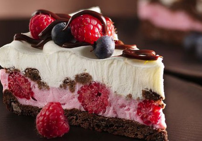 Za biskvit bjelanjcima dodajte sol i istucite čvrst snijeg. Šećer i žumanjke istucite, dodajte im ulje, a zatim i brašno, gustin, kakao prah i prašak za pecivo. Smjesu dobro izmiješajte električnim mikerom dok ne postane gusta i ljepljiva. Čvrst snijeg lagano umiješajte u smjesu. Lim za pečenje obložite pek papirom i u njemu rasporedite smjesu. Prvih 10 minuta pecite na 160°C, a zatim pojačajte temperaturu na 180° narednih 15 minuta. Za pripremu kreme izmiksajte šećer i bjelanke dok ne postanu čvrsti. U to umiješajte jogurt. Maline pospite s malo šećera i ostavite neko vrijeme na sobnoj temperaturi dok ne puste sok. Bjelanjcima dodajte maline i lagano promiješajte žlicom. Kad je biskvit pečen ravnomjerno ga premažite kremom pospite čokoladnim mrvicama. Vrh kolača premažite šlagom. Ukrasite ga ostatkom malina i čokoladnim preljevom i po želji dodajte nekoliko svježih borovnica.