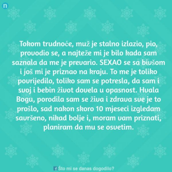 Tokom trudnoće, muž je stalno izlazio, pio, provodio se, a najteže mi je bilo kada sam saznala da me je prevario. SEXAO se sa bivšom i još mi je priznao na kraju. To me je toliko povrijedilo, toliko sam se potresla, da sam i svoj i bebin život dovela u opasnost. Hvala Bogu, porodila sam se živa i zdrava sve je to prošlo, sad nakon skoro 10 mjeseci izgledam savršeno, nikad bolje i, moram vam priznati, planiram da mu se osvetim.