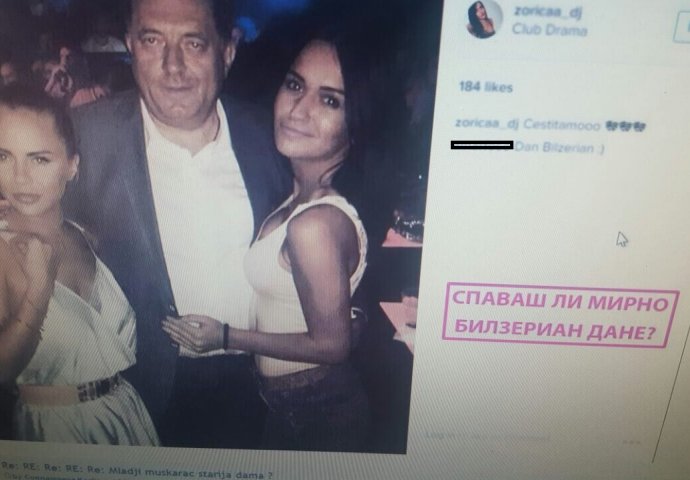 Jedna od lokalnih banjalučkih „starleta“ Zorica Đuričić objavila je fotku na društvenoj mreži Instagram na kojoj su ona i još jedna mlađa djevojka u zagrljaju i opuštenom druženju sa predsjednikom RS. Slika je najvjerovatnije nastala u banjalučkom noćnom klubu Drama, ali nije poznato kada. No, u ovom banjalučkom klubu je prije nekoliko sedmica burno proslavljen dan manjeg bh. entiteta, a kako možete vidjeti i u videu, uz nacionalističke pjesme i podizanje tri prsta.