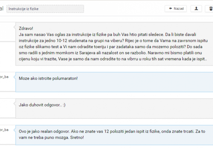 • Vidjeli smo da dajete instrukcije. Mi bismo vam na završnom ispitu slikali test, a vi nam odradite teroriju i nekoliko zadataka samo da možemo položiti. Ranije smo radili sa jednim momkom iz Sarajeva, ali se on razbolio. Platili bi cijenu koju tražite, samo da nam to odradite na viberu dok traje ispit – napisali su u poruci Arminu Čičku osnivaču ove stranice.