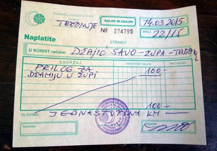 Savo Džajić iz Župe kod Trebinja danas je ponovo obradovao tamošnjeg imama Huseina ef. Hodžića, jer je na adresu lokalne džamije poslao 100 KM, kao dobrovoljni prilog za održavanje ovog vjerskog objekta, piše bh. novinska agencija Patria.