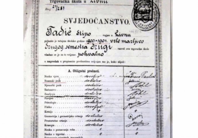 NEPOBITNI DOKAZ: Stipo Tadić je u školskoj 1900/1901 godini u Trgovačkoj školi Livno imao bosanski jezik!