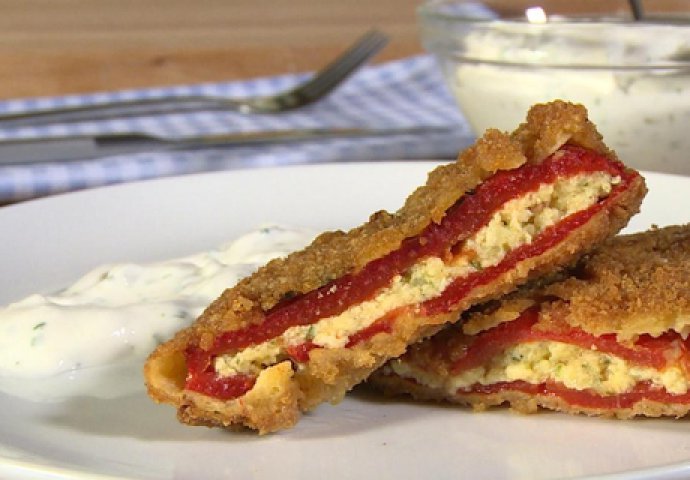 Paprike ocijedite i posušite papirnatim ubrusom. Siru dodajte 2 jaja, sitno nasjeckani ili protisnuti češnjak, papar, prašak za pecivo, 1 žlicu krušnih mrvica, peršin i Vegetu. Dobro izmiješajte, pa dobivenom smjesom nadjenite paprike. Tako pripremljene paprike prvo umočite u brašno, a zatim u razmućena preostala jaja i na kraju u krušne mrvice. Panirane paprike pržite u dubokom ulju do zlatnosmeđe boje.