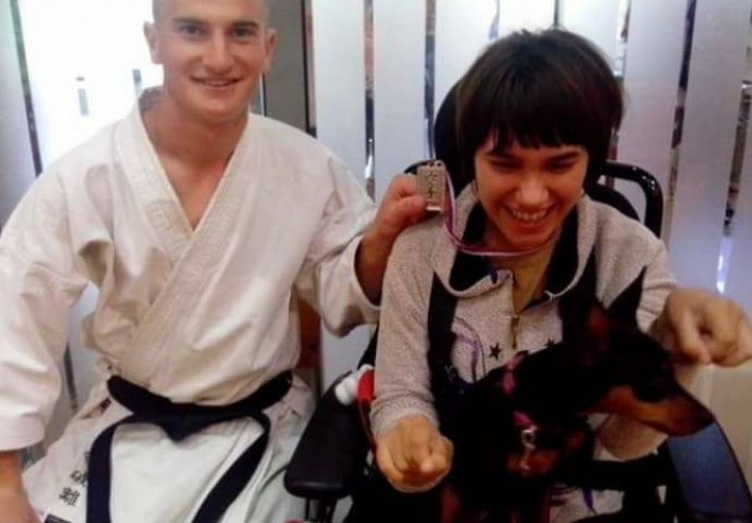 VISOKO, 13. aprila (FENA) - Visočki karatist Sađid Bulut na nedavno održanom međunarodnom turniru u tradicionalnom karateu u Sloveniji obradovao je dvadesetogodišnju Janu Ljondov, koja boluje od cerebralne paralize, poklonivši joj srebrenu medalju, a njen osmijeh kada je to učinio, kaže, pamtit će cijelog života.