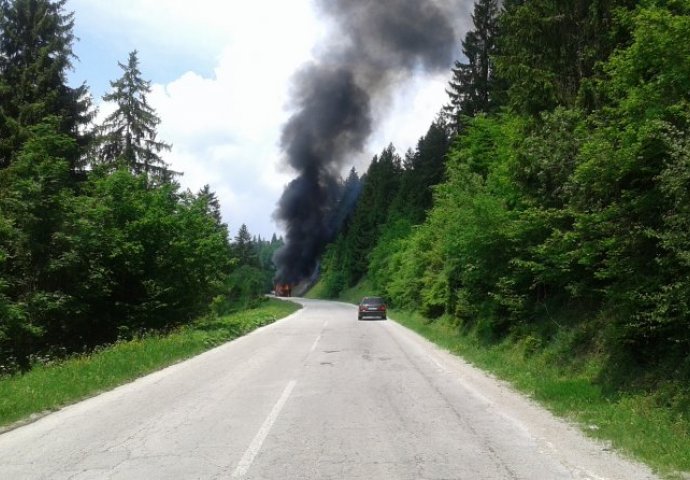 Na regionalnom putu R- 413, koji vodi od Turbeta prema Vlašiću, na dionci sela Šešiči i Gostilj, danas oko 12:30 zapalio se kombi prevozničke firme iz Travnika.
