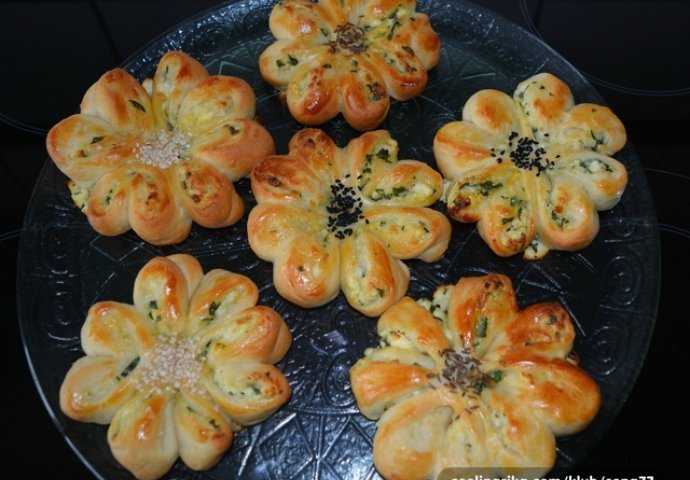 Onda uzmite nožić i sijecite. Prvo gore jedan rez kao na kompasu sjever, jug istok i zapad. Ne smijete skroz prerezati, ostavite 1 cm od sredine. Tako ćete dobiti 4 trokutića, zatim svaki trokutić još jednom kroz sredinu i dobit ćete 8 malih trokutića ili cvijetnih latica. Sada svaku laticu uspravite da fil (sir i špinat) gleda na gore. Gotove cvjetiće redajte na pripremljen pleh. Cvjetiće premažite žumancem i pospite po sredini sjemenkama po želji. Pecite u zagrijanoj pećnici na 200 stepeni nekih 20-25 minuta dok cvjetići ne dobiju lijepu zlatno-smeđu boju.