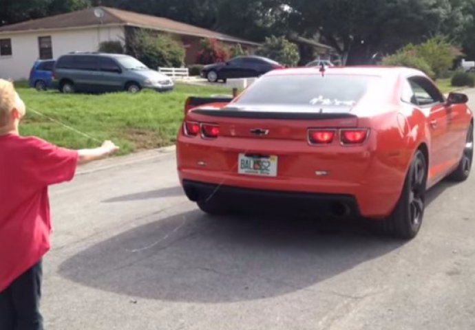 Jedan kraj uzice zavezao je za zub, a drugi za svoj Chevrolet Camaro.
