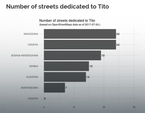 S druge strane najviše ulica posvećenih Titu imaju Makedonija i Hrtvatska – čak 24. Srbija ima 15 ulica posvećenih bivšem lideru Jugoslavije, Slovenija 14, a Crna Gora 7. Kosovo nema ni jednu ulicu sa maršalovim imenom, podaci su portala giocomai.github.io