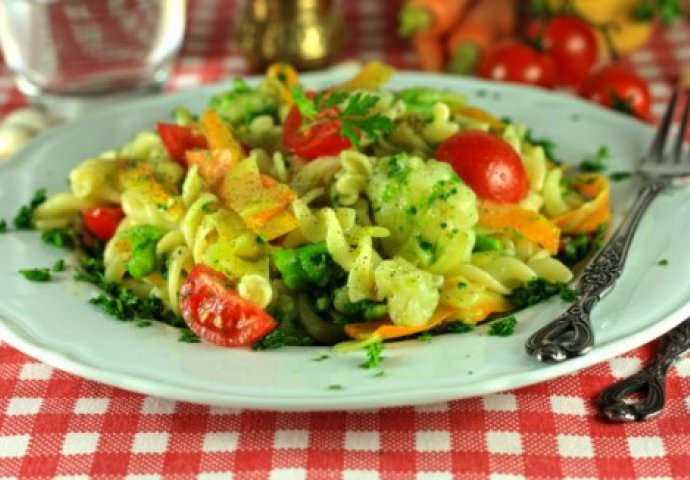 Karfiol i brokule podijeliti na sitnije cvjetove pa skuhati u posoljenoj vodi, izvaditi i ocijediti. Dok se to kuha, ljuštilicom za povrće isjeći mrkvu i tikvice na tračice, kao široke rezance. Oguliti i sitno isjeckati jedan čen bijelog luka, a čeri paradajz isjeći na polovine ili četvrtine. U vodu u kojoj se kuhalo povrće spustiti tjesteninu da se kuha, a na drugoj ringli, u dubljem tiganju, ugrijati ulje pa propržiti trake mrkve. Kad omekšaju, dodati i trake tikvica i dinstati još malo. Kad su i tikvice omekšale, isključiti ringlu i dodati bijeli luk, i sve promiješati. Tjesteninu rešetkastom kašikom vaditi na tiganj, posoliti, pobiberiti, promiješati lijepo, zatim dodati bareni karfiol, brokule i isjeckan paradajz, i ovlaš promiješati. Po tanjiru posuti sjeckani peršun, servirati tjesteninu, a preko svake porcije narendati malo pecorino romano sira.