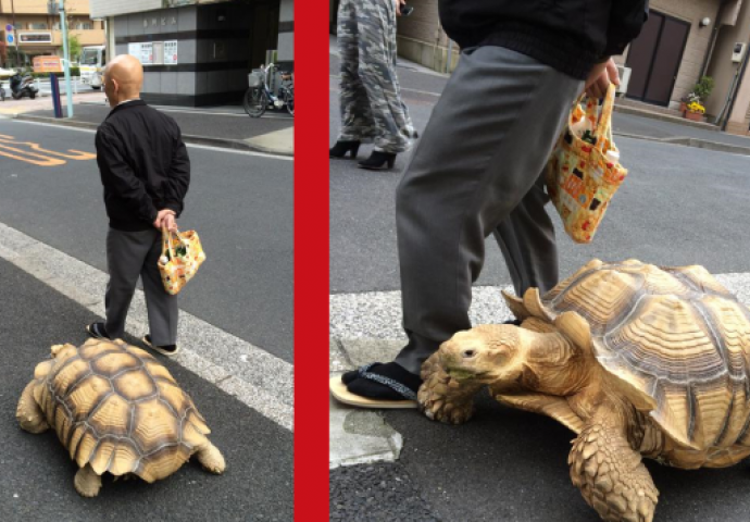Naime, stanovnici Japana su uslikali starijeg muškarca kako šeta s ogromnom afričkom mamuzastom kornjačom, tzv. 'kopačicom' ili rovašicom'.
