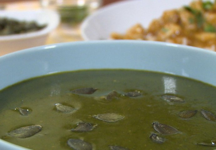 Zakipite 1l vode. U nju stavite očišćeni i oprani špinat, koncentrat rajčice, malo soli i papra. Smanjite vatru i pustite da lagano kuha oko 10 minuta, pa dodajte povrtne temeljce i kuhajte još 5 minuta.  Zgnječite češnjak i zajedno s korijanderom ga sitnije nasjeckajte. Na lagano zagrijano maslinovo ulje dodajte smjesu od češnjaka i korijandera i kratko ga popržite tek toliko da pusti miris (1-2 minute). Tako poprženi češnjak s korijanderom prebacite u lonac s juhom i pustite da lagano vrije još 2 do 3 minute. Juhu dobro usitnite štapnim mikserom, a po potrebi dodatno začinite i poslužite.