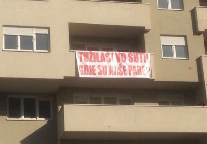 Na zgradi su osvanuli transparenti sa natpisima: “Tužilaštvo šuti, gdje su naše pare” i “Hvala gradonačelniče, niste ispunili obećanje!”.