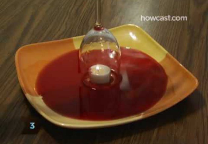 Zalijepite malu svijeću za tanjir, u njega onda sipajte vino, najbolje bi bilo crno. Zapalite svijeću i preko nje stavite vinsku čašu.
