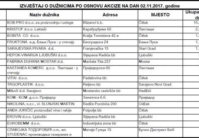 U Izvještaju o dužnicima po osnovu akcize na dan 2. novembar 2017. godine prva na listi je kompanija iz Čitluka - BOB-PRO d.o.o. koja duguje više od 10 miliona KM.