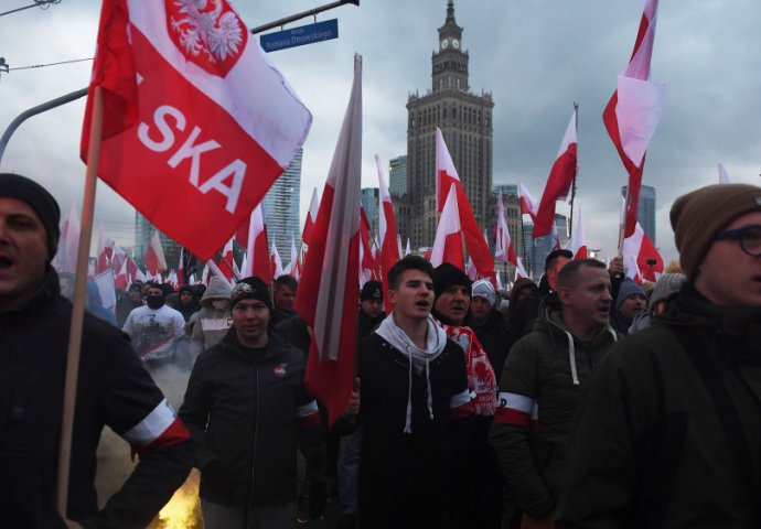 Destetine hiljada desničarskih nacionalista su se okupile jučer na dan nezavisnosti Poljske, bacajući dimne bombe i noseći slogane na kojima piše „bijela Evropa bratskih nacija“, te uzvikivali islamofobične parole, piše „Guardian“.