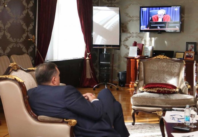 Entitetski predsjednik Milorad Dodik u kabinetu u Palati RS u Banjaluci uživo prati izricanje presude nekadašnjem komandantu Glavnog štaba Vojske Republike Srpske Ratku Mladiću u Haškom tribunalu.