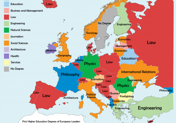 O obrazovanju političara u Bosni i Hercegovini dosta smo pisali proteklih mjeseci, a sada je jedan kartograf odlučio da se pozabavi pitanjem obrazovanja šefova svake evropske države, a mapu je podijelio na Redditu.
