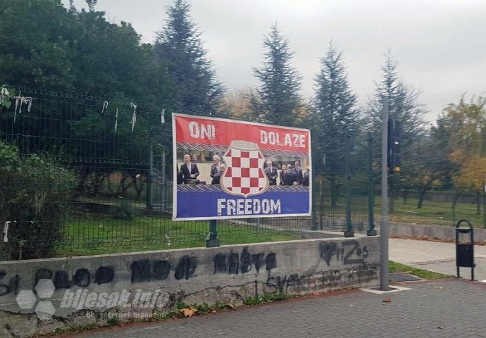 Veliki plakat sa fotografijom haške šestorke i grbom Herceg Bosne osvanuo je  na dan izricanja presude na ogradi u blizini mostarske biskupije.