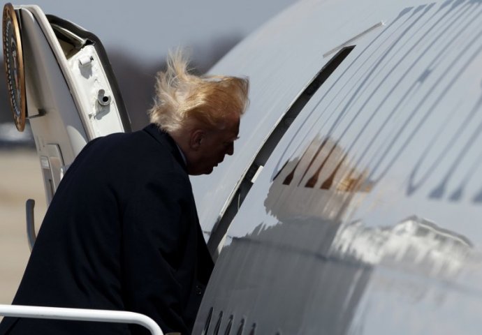 Donald Tramp snimljen je kako ulazi u predsjednički avion prije poletanja za Zapadnu Virdžiniju. Tramp je podigao ruku kako bi pozdravio okupljenje, kada je vjetar pokvario njegovu frizuru.