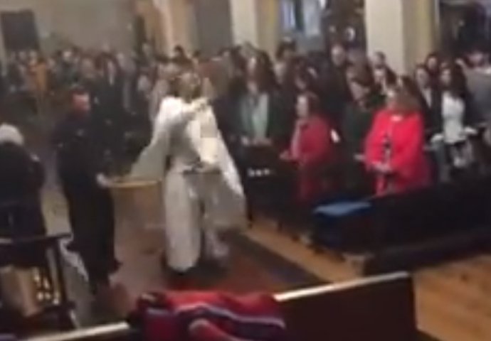Na oduševljenje prisutnih vjernika, pop je u dugačkoj bijeloj mantiji i na trotinetu uletio u crkvu i počeo da pravi krugove dok su za njim trčala ostala sveštena lica.