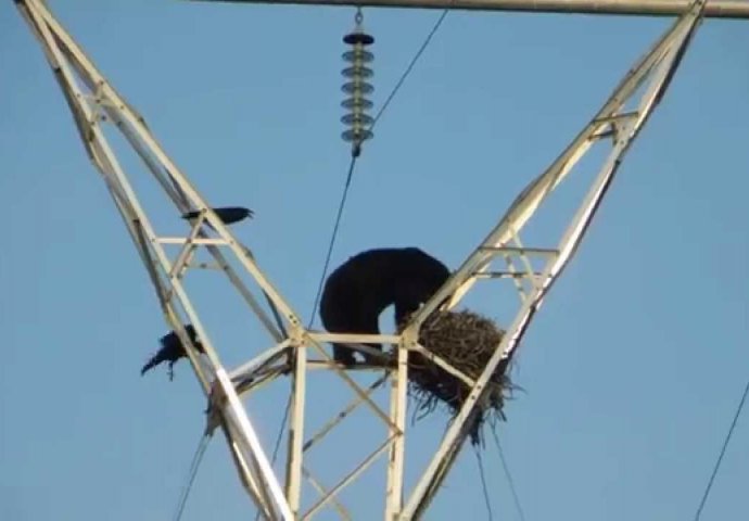 Medvjed se popeo na dalekovod kako bi uništio gnijezdo gavranova.