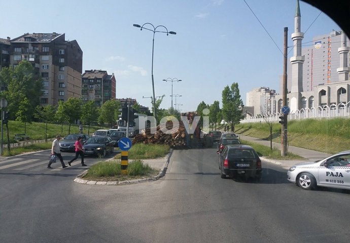 OTEŽAN SAOBRAĆAJ: Kod džamije Kralj Fahd prevrnuo se kamion natovaren deblima