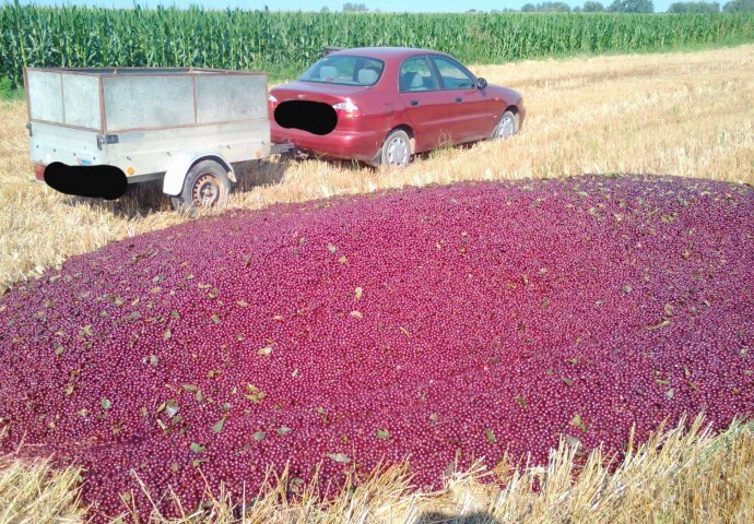Fotografiju je na Facebook-u objavio Andrija Branković, na njoj se vidi automobil na livadi i kilogrami i kilogrami višanja rasutih po polju, jer cijene nema, ni one najmanje.