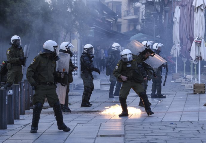 Ispred zgrade parlamenta u Atini, grupa maskiranih ljudi zasula je pirotehničkim sredstvima i drugim predmetima policiju koja je uzvratila suzavcem, javila je makedonska agencija MIA.