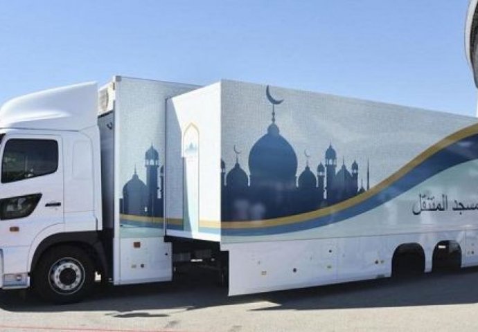 Veliki bijelo-plavi kamion polako izlazi ispred stadiona, rasklapa se i pretvara u mjesto za bogosluženje. Dobrodošli u mobilnu džamiju, navode iz kompanije za sportska i kulturna događanja u Tokiju.