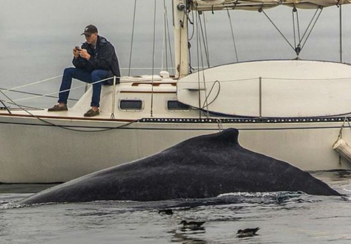 Fotograf Eric Smith snimio je fotografiju na kojoj čovjek gleda u svoj mobilni, dok ogroman kit prolazi kraj njegove jedrilice kod kalifornijske plaže Redondo. Na taj način propustio je da vidi nešto što je čekao čitavog života i što se jako rijetko viđa.