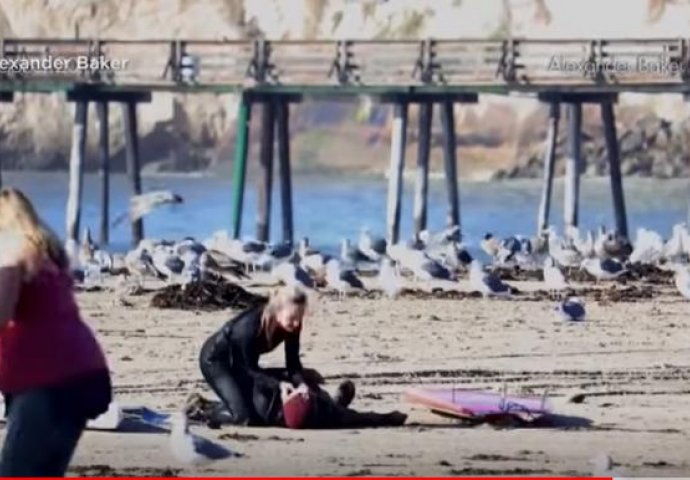 U početku vidimo samo ptice, a onda se u kadru pojavljuje muškarac s daskom za surfovanje koji pada. Andrea je pribrano reagovala i odmah primijenila postupak oživljavanja.