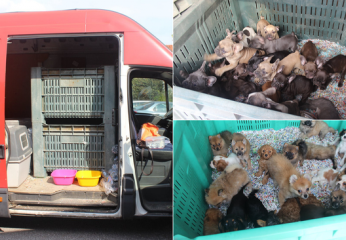 Nakon što je 45-godišnji vozač otvorio vrata kombija, pokazalo se da on i 50-godišnji zemljak, suvozač, nisu jedini putnici. U teretnom dijelu vozila bilo je u krletkama skriveno 107 živih štenaca i jedna na putu uginula životinja, navodi Hina.