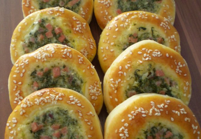 Sve suhe sastojke pomiješajte. Svježi kvasac dodajte u malo mlakog mlijeka sa malo soli, šećera i jednom kašičicom brašna. Ostavite da odstoji. Kada kvasac nadođe dodajte ga u suhe sastojke i dodajte preostale sastojke tijesta. Tijesto dobro izradite, pa onda rastanjite na debljinu otprilike 1,5 centimetara. Pogačice vadite čašom promjera oko 8 centimetara. Poredajte ih u podmazanu tepsiju i ostavite da nadođu. Pomiješajte sve sastojke za fil. Manjom čašicom pravite udubljenja, pa onda udubljenja napunite filom. Ivice premažite umućenim jajetom i pospite susamom. Pecite 20ak minuta na 200 stepeni dok ne porumene (ovisi od rerne do rerne).