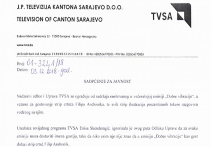 Nadzorni odbor i Uprava Televizije Kantona Sarajevo (TVSA) se ograđuju od sadržaja emitovanog u večerašnjoj emisiji "Dobre vibracije", a u vezi sa gostovanjem strip crtača Filipa Andronika, te svih strip ilustracija prezentiranih tokom razgovora sa njim.