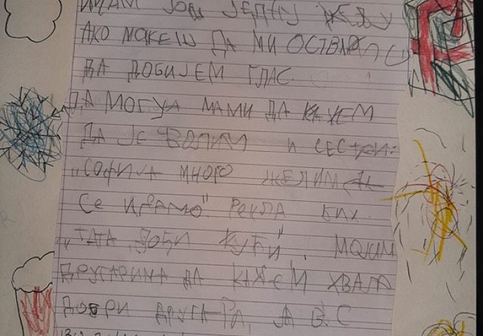 - Dragi Deda Mraze, Bila sam dobra ove godine i zaslužila sam čokoladu. Imam još jednu želju, ako bi mogao da mi ispuniš da dobijem glas. Da mogu mami da kažem da je volim, i sestri: "Sofija, mnogo želim da se igramo!" Rekla bih: "Tata, dođi kući!" Mojim drugarima da kažem: "Hvala dobri drugari, ja vas volim!" Ako je to puno želja, onda ne mora čokolada. Može samo ovo drugo! Voli te Peka.