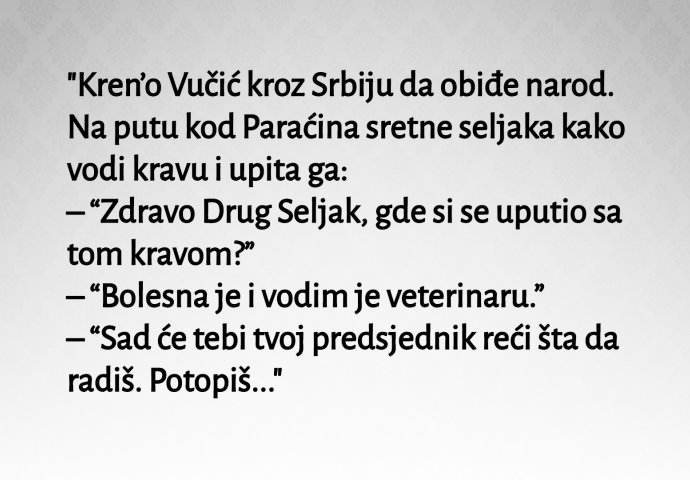 "Kren’o Vučić kroz Srbiju da obiđe narod. Na putu kod Paraćina sretne seljaka kako vodi kravu i upita ga: