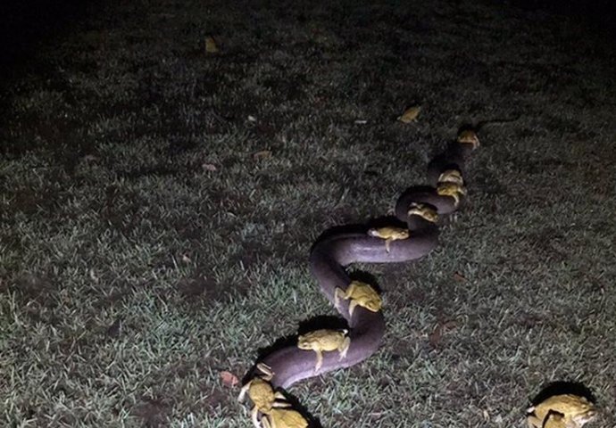 Ogromna oluja na sjeveru Australije u nedelju priredila je fascinantan i užasan prizor – deset žaba krastača prikačenih za leđa pitona od tri i po metra.
