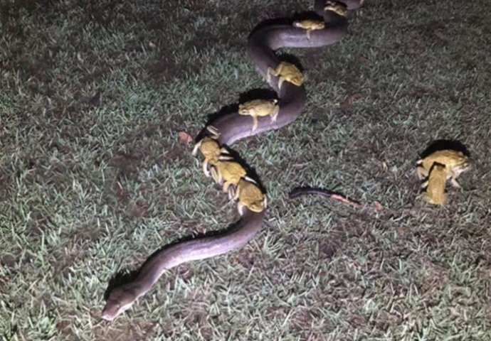 Ogromna oluja na sjeveru Australije u nedjelju je priredila nevjerovatan prizor - deset žaba krastača prikačenih za leđa pitona od tri i pol metra.