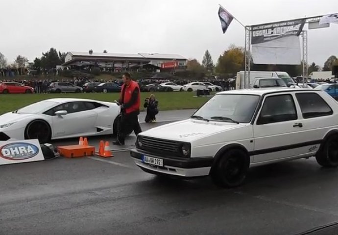 Naime, vozač Lamborghini Huracán smijao se kad je vidio da mu je protivnik u ovoj trci Golf 2, ali nije znao šta se krije ispod njegove haube.