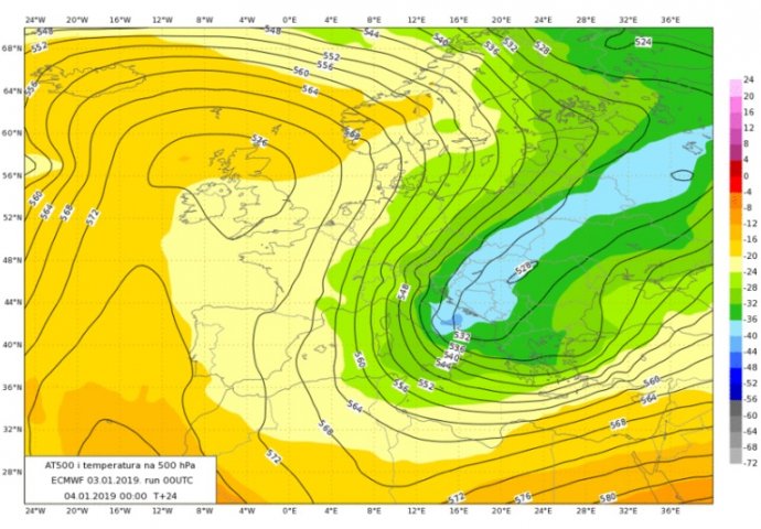 Premještanje duboke ciklone istokom Europe uz istovremeno snažnu anticiklonu od 1045 hPa nad britanskim otočjem dovest će do naglog prodora vrlo hladnog zraka sa sjevera u naše krajeve, piše Neverin.