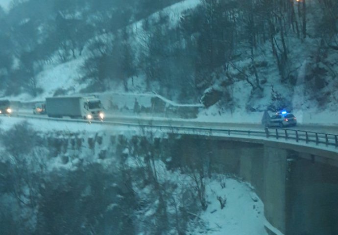 Na dionici magistralnog puta M-17, u mjestu Zukići kod Konjica, na saobraćajnici se trenutno nalazi nekoliko zaglavljenih kamiona sa prikolicama.