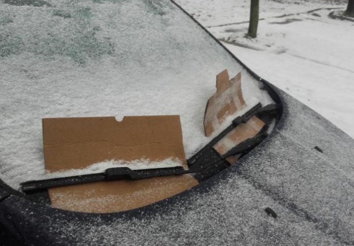 Vozač sa ove fotografije se dosjetio da stavi dva obična kartona ispod brisača, i tim jednostavnim potezom riješi problem.