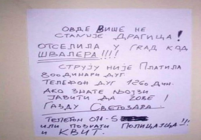 - Ovdje više ne stanuje Dragica. Odselila u grad kod švalera!!!! Struju nije platila, 800 dinara dug. Telefon dug 1.260 din. Ako znate njojzi javite da zove gazdu Svetozara! Telefon... Ili pozvati policajca!!! I KVIT - napisao je on.