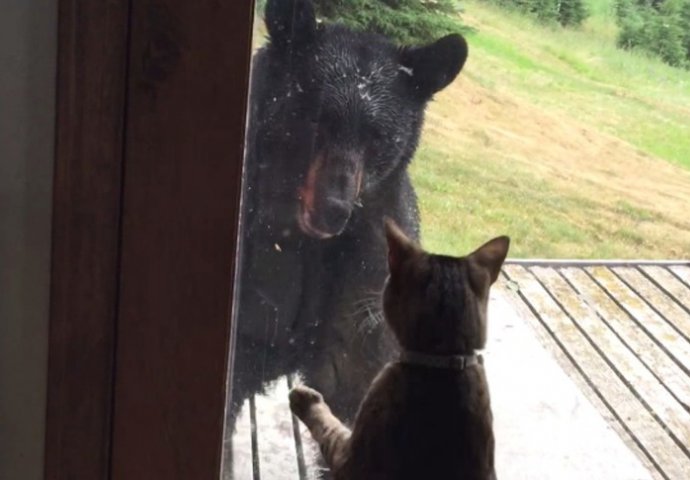 Sučeljavanje između mačke i medvjeda koje se dogodilo preko stakla završilo je na najmanje očekivan način.
