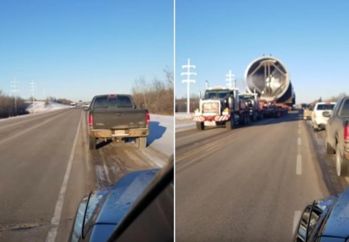 Vozače u Alberti iznenadio je nevjerovatan prizor na autoputu, kada su ispred sebe ugledali karavan kamiona koji vuku ogroman teret.