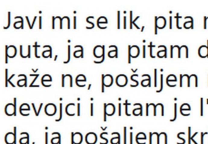 "Javi mi se lik, pita me da izađemo xy puta, ja ga pitam da li ima djevojku, on kaže ne, pošaljem njegov profil u DM djevojci i pitam je l' joj to dečko, ona kaže da, ja pošaljem skrinšotove, ona raskine sa njim, on se iz*rka na mene što sam joj rekla, sačuvajmo minimum dostojanstva", ukratko je ona pojasnila.