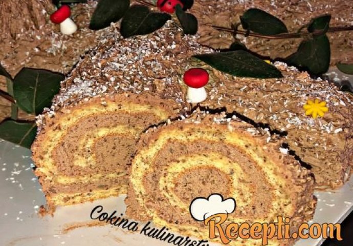 Fil II: orahe preliti sa vrelim mlijekom, dobro izmješati i ostaviti da se ohladi pa sjediniti sa prvim filom. Kore premazati sa filom pa opet uviti u rolate. Od jednog rolata formirati stablo, a drugi rolat isjeći na 2 ili 3 dela pa formirati grane. Tortu ukrasiti po želji.