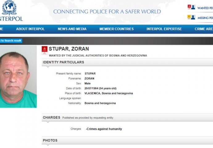 Interpol je raspisao međunarodnu potjernicu za Zoranom Stuparom, bivšim pripadnikom Stanice javne bezbjednosti (SJB) Vlasenica protiv kojeg je Sud BiH potvrdio optužnicu zbog zločina protiv čovječnosti počinjenog u tom mjestu.