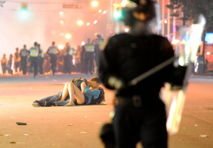 Slika para strastvenog poljupca koji se dogodio usred nemira 2011. u Vankuveru, kada su navijači hokeja na ledu nakon poraza svog tima izašli na ulice, obišla je čitav svijet.