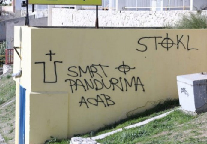"Smrt pandurima", piše crnim sprejem na ulazu u vrtić. Ispod toga piše "ACAB", što je akronim engleskog izraza "All Cops Are Bastards", što što bi u slobodnom prevodu značilo "Svi panduri su kopilad".